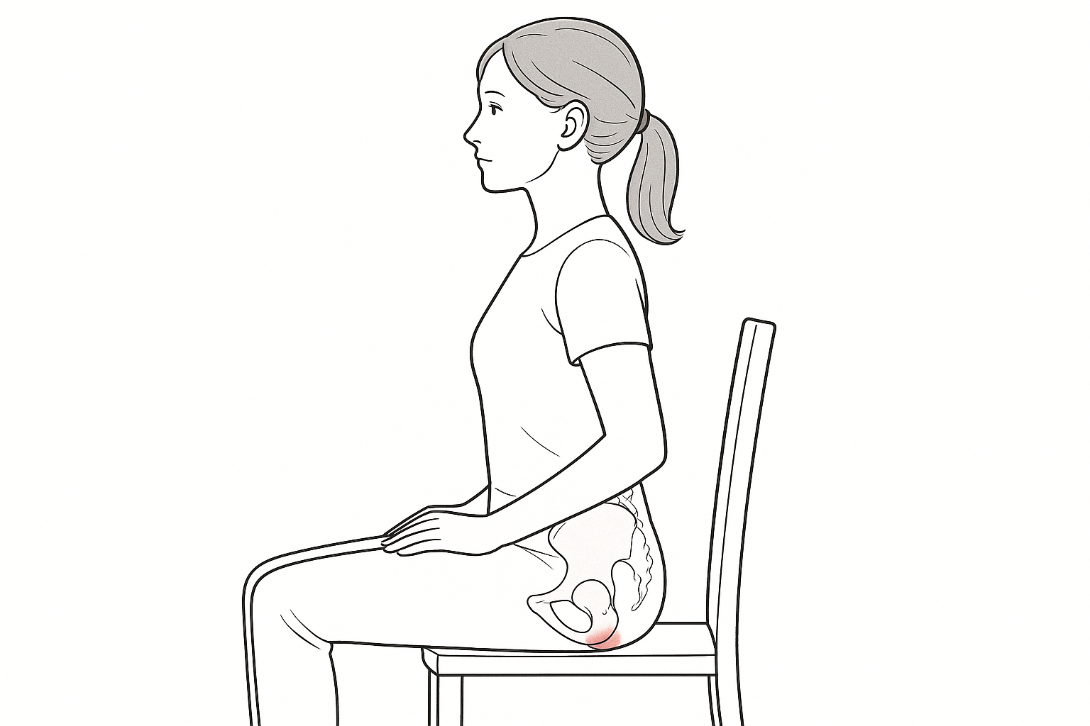 背もたれに寄りかかり、骨盤が後ろに傾いたまま座ると、坐骨で支えることができず、仙腸関節(骨盤と仙骨のつなぎ目)に負担がかかります。